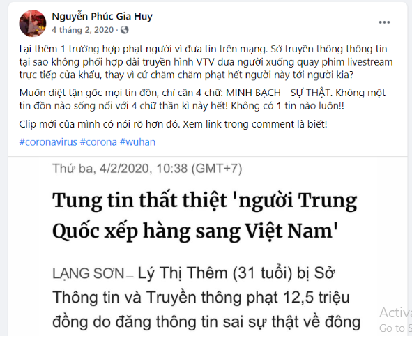 Cùng ngày anh ta viết: “Sở truyền thông thông tin tại sao không phối hợp với Đài truyền hình VTV đưa người xuống quay phim livestream trực tiếp tại cửa khẩu, thay vì cứ chăm chăm phạt tiền người này, người kia”