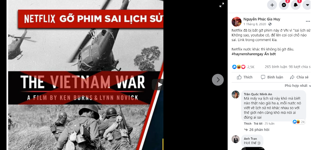 Ngày 1-8-2020, khi Netflix bị chính phủ Việt Nam yêu cầu gỡ bỏ bộ phim The Vietnam war của đạo diễn Ken Burns và Lynn Novick vì những thông tin sai sự thật lịch sử, Dưa Leo viết “Netflix bị bắt gỡ phim ở VN vì sai lịch sử, để lên coi chỗ nào sai. Link trong comment (phần bình luận) kìa. Netflix nước khác không bị gỡ đâu #haynensharengay”
