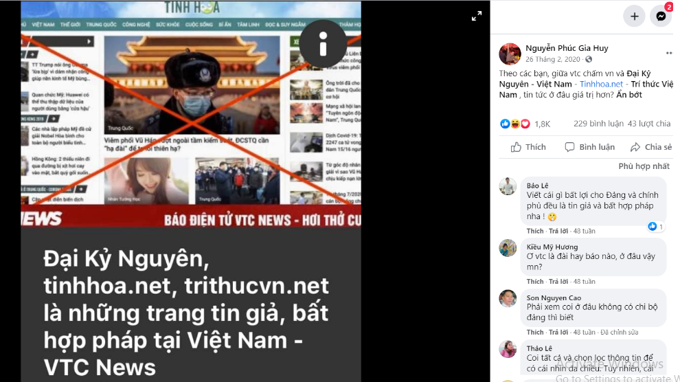 Bên cạnh đó, anh ta thường xuyên chia sẻ thông tin từ các trang mạng sai sự thật như Đại Kỷ Nguyên, Trí Thức Việt Nam (các trang này hiện nay đã bị Facebook xóa khỏi mạng xã hội vì hành vi tung tin giả), Nhật ký Yêu nước, tạp chí Luật khoa của VOICE (tổ chức ngoại vi Việt tân). Khi VTC cùng nhiều đài truyền hình, cơ quan báo chí khác đưa tin: Đại Kỷ Nguyên, Tinhhoa.net, trithucvn.net là những trang tin giả, bất hợp pháp tại Việt Nam, ngày 26-2-2020, Dưa Leo viết lên mạng “Theo các bạn giữa vtc chấm vn và Đại Kỷ Nguyên – Việt Nam – Tinhhoa.net – Trí thức Việt Nam, tin tức ở đâu giá trị hơn?