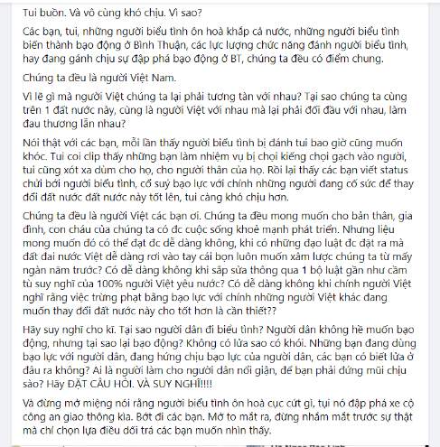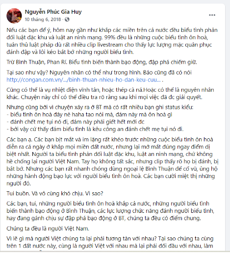 Ngày 10-6-2018, NPGH chia sẻ bài viết khẳng định rằng “99% các cuộc biểu tình đều là ôn hòa dù rất nhiều clip livestream cho thấy lực lượng mặc quân phục đánh đập và lôi kéo bắt bớ người biểu tình (…) Các bạn ạ. Các bạn bịt mắt và im lặng rất khéo trước những cuộc biểu tình ôn hoà diễn ra cả ngày ở khắp mọi miền đất nước, nhưng lại mở mắt đúng ngay điểm dị biệt nhất. Người ta biểu tình phản đối luật đặc khu, luật an ninh mạng, chứ không hề chống lại người Việt Nam. Tay họ không tất sắc, nhưng clip thấy rõ họ bị đánh, bị bắt bớ. Nhưng các bạn rất nhanh chóng dùng ngoại lệ Bình Thuận để cổ vũ, ủng hộ những hành động bạo lực với người biểu tình ôn hoà. Các bạn cười miệt thị những người đó. (…) Chúng ta đều là người Việt các bạn ơi. Chúng ta đều mong muốn cho bản thân, gia đình, con cháu của chúng ta có đc cuộc sống khoẻ mạnh phát triển. Nhưng liệu mong muốn đó có thể đạt đc dễ dàng không, khi có những đạo luật đc đặt ra mà đất đai nước Việt dễ dàng rơi vào tay cái bọn luôn muốn xâm lược chúng ta từ mấy ngàn năm trước? Có dễ dàng không khi sắp sửa thông qua 1 bộ luật gần như cầm tù suy nghĩ của 100% người Việt yêu nước? Có dễ dàng không khi chính người Việt nghĩ rằng việc trừng phạt bằng bạo lực với chính những người Việt khác đang muốn thay đổi đất nước này cho tốt hơn là cần thiết??”. Kèm theo đó, anh ta dẫn chứng bằng hình ảnh từ hai người là Hồ Ngọc Bảo Linh và Võ Minh Hiển. Trong đó fb ông Hiển khẳng định “biểu tình chống dự luật đặc khu biến thành cơ hội thanh toán ân oán với bọn tham quan cướp đất ở Bình Thuận”. Còn Fb bà Hồ Ngọc Bảo Linh cho rằng “người biểu tình không làm việc này mà là dàn cảnh. 1 nhóm an ninh 10 người xông vào quấy rối lôi một số người dân”