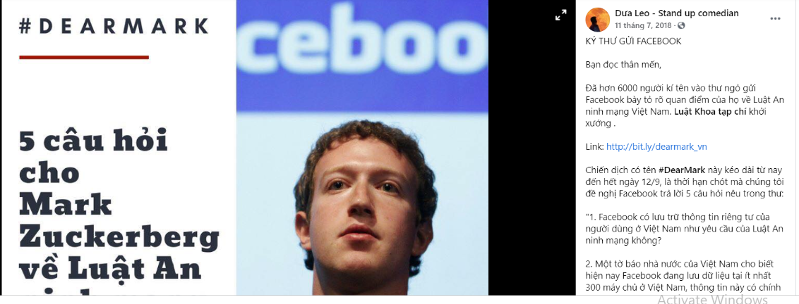 Trong đó, anh ta nói rằng: “Dự luật an ninh mạng giống như quyền lực tuyệt đối mà ai mở miệng sẽ biến mất. Trong khi an ninh mạng có nghĩa là an ninh trên mạng chứ không phải là cơ quan an ninh bắt những công ty cung cấp dịch vụ internet phải lưu giữ thông tin người dùng và cung cấp cho cơ quan an ninh mạng để nghi ngờ người này, người nọ. Nếu một bộ luật mù mờ này được thông qua thì đó sẽ là điều vô cùng khủng khiếp đối với tất cả chúng ta” . Trên thực tế, đây là hành vi xuyên tạc sự thật bởi dự luật An ninh mạng được tham khảo từ nhiều đạo luật, bộ luật khác nhau trên thế giới, được Quốc hội xây dựng, lấy ý kiến nhiều lần.