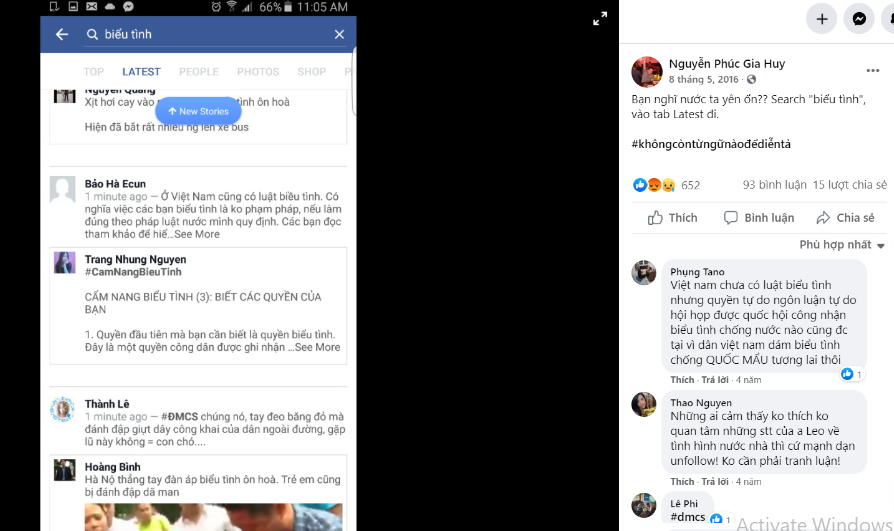 Ngày 15-5-2016, anh ta viết “FB bị chặn vì người ta sợ lan tin biểu tình, nhưng điều đó không cản đc người ta biểu tình với lên FB :)) ai đang online fb điểm danh nàooooooooooo” (Ảnh 21). Chưa dừng lại ở đó, anh ta làm video “Batman + Superman = VT” (Người Dơi + Siêu nhân = Việt tân) phản đối trước thông tin từ các cơ quan báo chí chính thống xác nhận tổ chức khủng bố Việt tân kích động người dân tham gia biểu tình tại TP Hồ Chí Minh và Hà Tĩnh. Theo đó, anh ta cho rằng lực lượng chức năng và báo chí dựng chuyện vì “Trời đất ơi chỉ có triệu, tỷ phú như Batman mới làm được thôi. Hai, cuộc biểu tình nào cũng cho tiền, cũng kích động hết nhưng mà không ai bắt được. Cho đến giờ, bắt được có hai đứa duy nhất. Những đứa còn lại đâu rồi? Phải chăng tụi nó trốn hết? Hóa trang theo kiểu siêu nhân? Đeo kính vô là không ai nhận ra ta! Mà nói khơi khơi thế ai tin”
